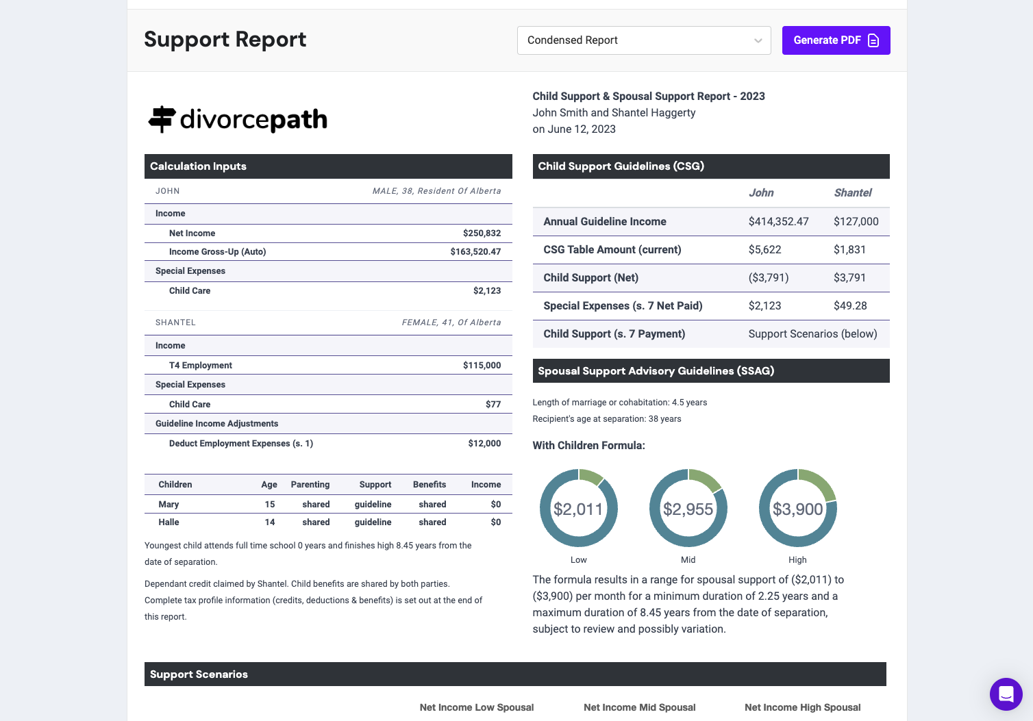 Includes guideline income adjustments, automatic gross-ups, government benefits, custom support scenarios such as 50/50 NDI split and more.