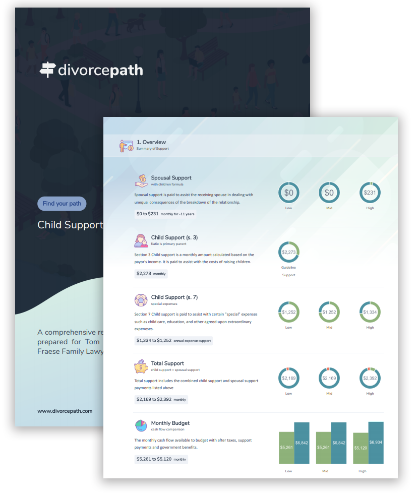 Divorcepath includes a monthly budget (net income) breakdown for each person, allowing you to budget in different support scenarios and determine what's right for your family.
